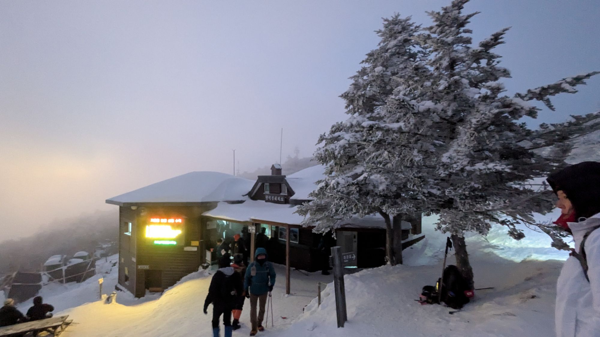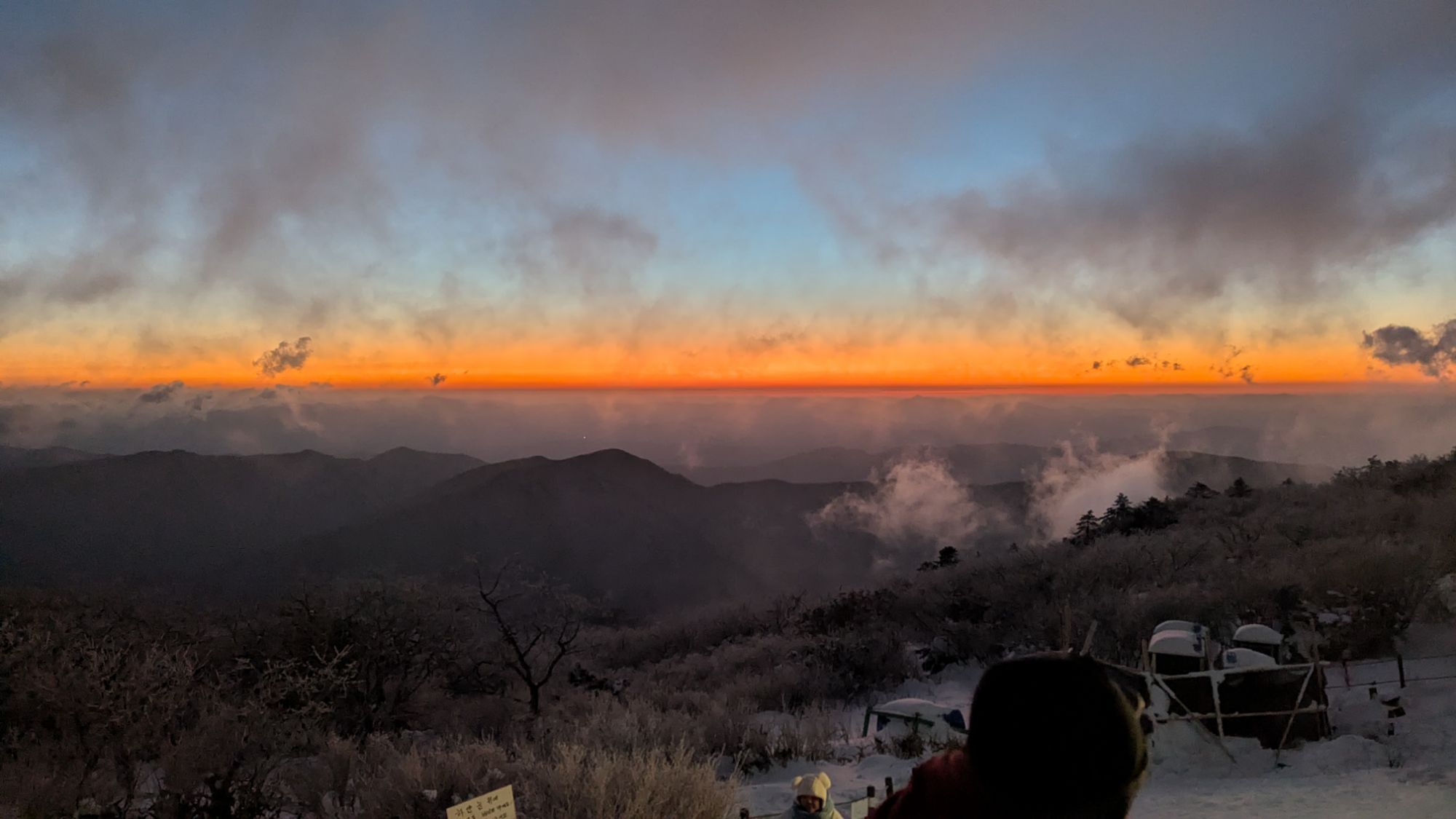 향적봉에 도착한 시간은 약 6시 30분이었는데, 취사장에는 많은 사람들이 식사를 하며 추위를 피하고 있었습니다. 저도 간단하게 보온병의 보리차와 김밥으로 식사를 하고 7시 20분경 향적봉에 오르니 많은 사람들이 일출을 기다리고 있었습니다.