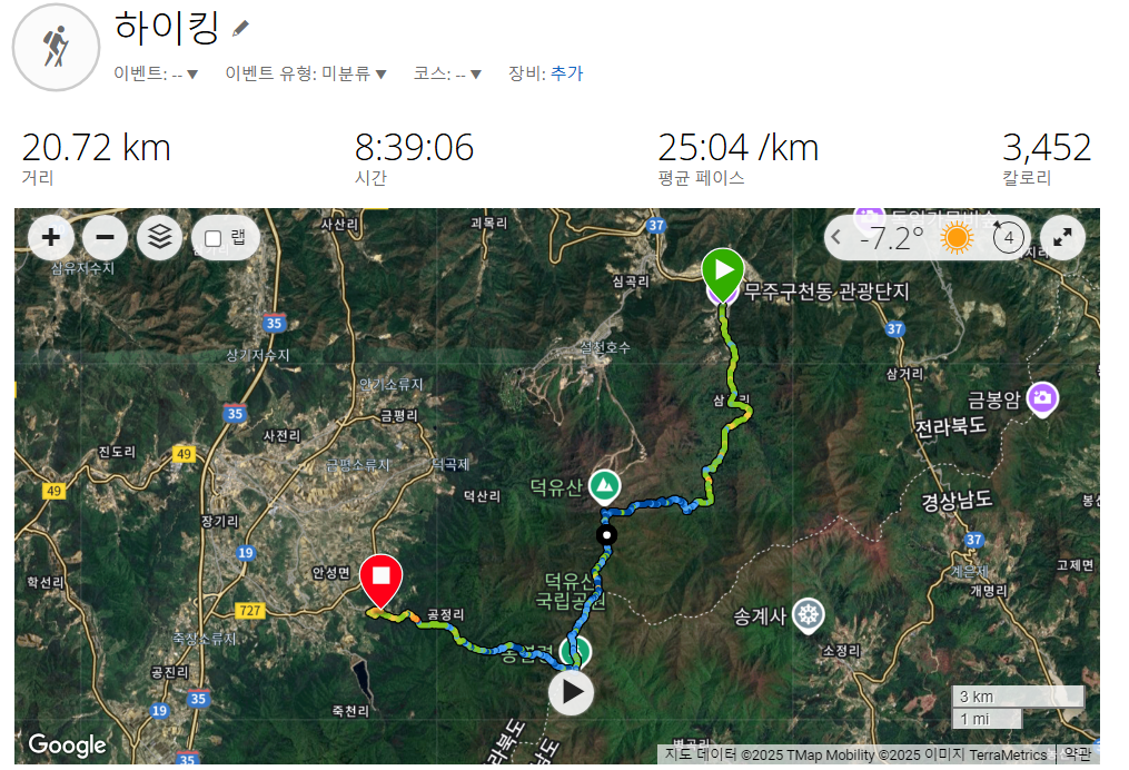 2025년에는 덕유산으로 안내산악회와 함께 무박 2일 일정으로 일출산행을 계획했습니다 작년 겨울에는 당일코스로 안성탐방지원센터를 시작으로 동업령, 백암봉, 중봉, 향적봉, 백련사, 삼공리 코스를 다녀왔습니다. 이번 무박코스는 향적봉 일출을 보기 위해 반대 방향으로 되어 있습니다.