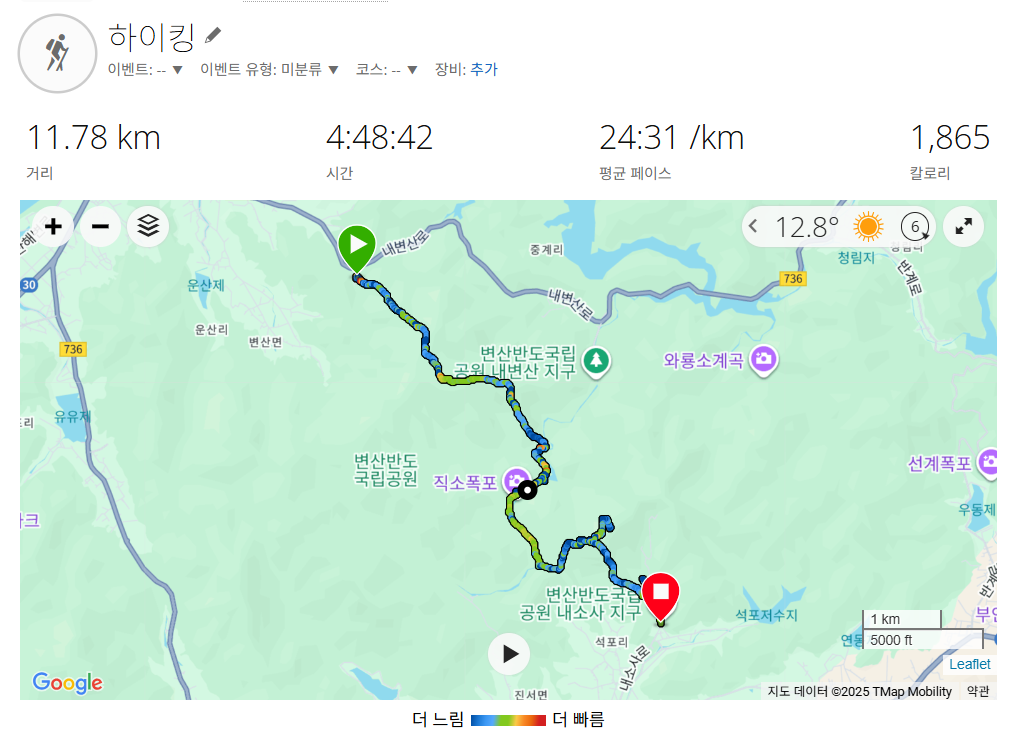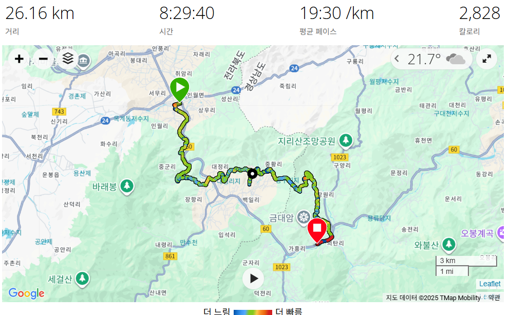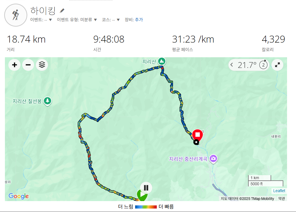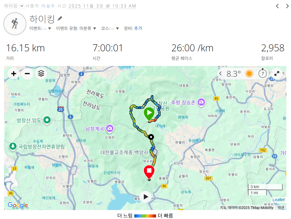 위 사진에 나온 거리와 시간은 제가 출발을 늦게 체크해서 실제 거리는 8km에 4시간 정도 소요되었습니다.