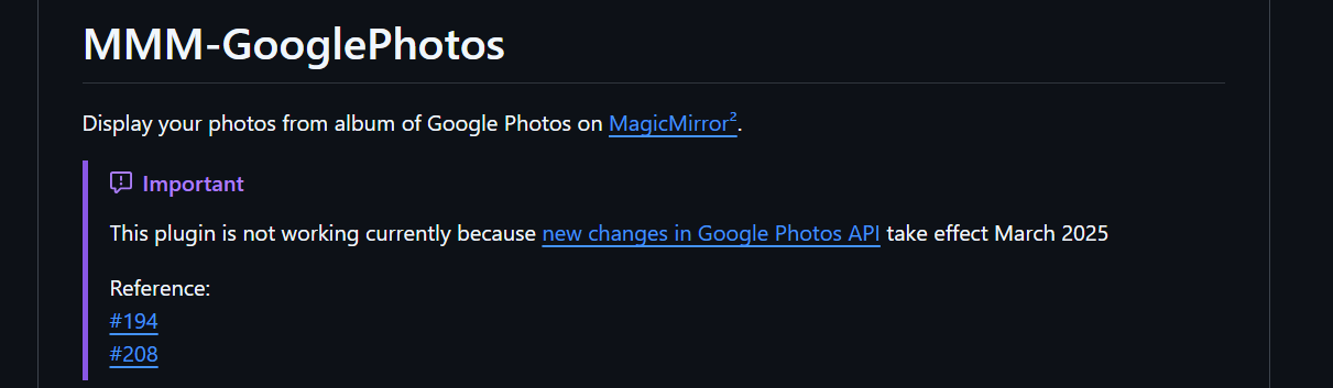 하지만 행복은 길지 않았습니다. 어느 날부터 매직미러가 더 이상 사진을 보여주지 못하는 문제가 발생했습니다. 원인을 찾아보니, 제가 사용하던 MMM-GooglePhotos 모듈이 의존하던 구글 포토 API 정책이 변경되면서 기능이 중단된 것이었습니다.