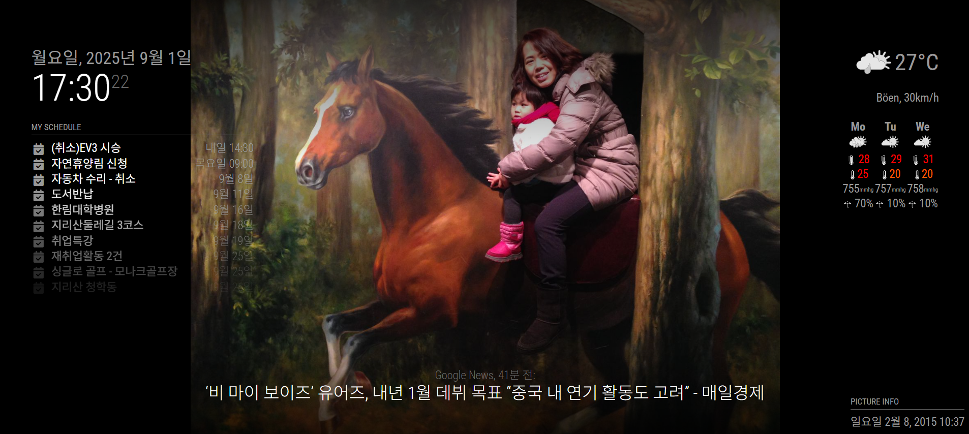 다음으로 찾은 대안은 MMM-BackgroundSlideshow였습니다. 이 모듈은 MMM-RandomPhoto의 단점을 완벽하게 보완해주었습니다. 세로 사진도 화면 비율에 맞게 자동으로 리사이징해줄 뿐만 아니라, 다양한 설정 옵션을 제공하여 입맛에 맞게 커스터마이징하기도 좋았죠.