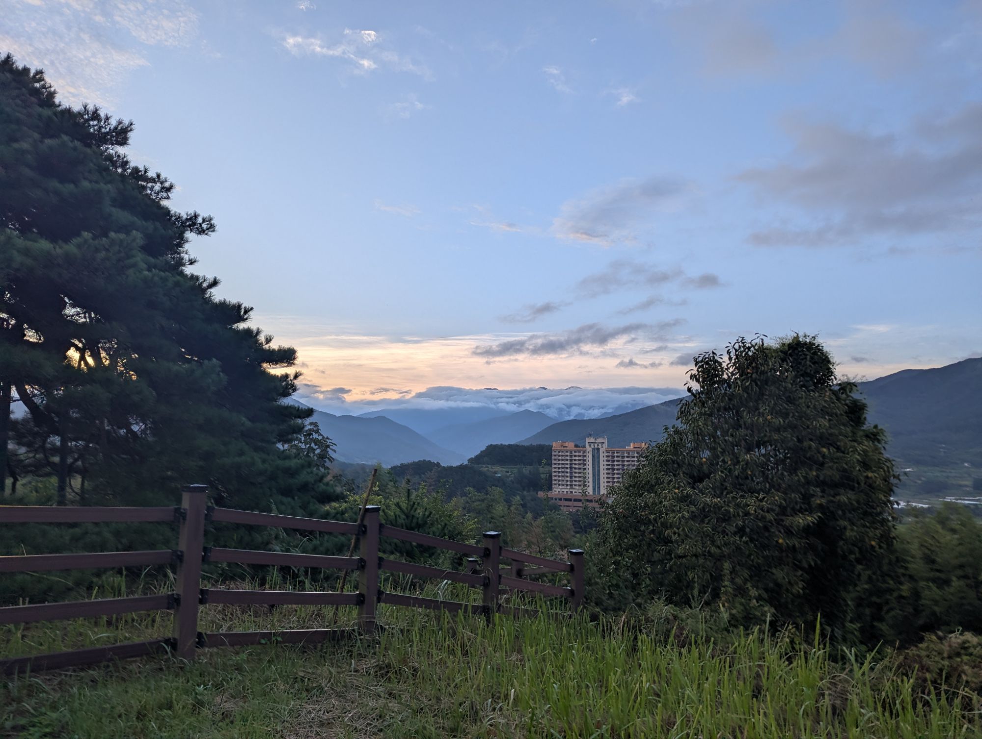 지인들과 함께 강릉 임해자연휴양림에서 1박 2일을 보냈습니다. 휴양림에 도착한 후, 뒷편의 등산로를 따라 정동진까지 산행을 다녀왔습니다. 비교적 짧은 산행이었지만, 능선에서 바라본 동해안과 저 멀리 보이는 하슬라아트월드, 선크루즈리조트가 인상적이었습니다. 산행 도중에는 안개가 몰려와 선크루즈리조트가 안개에 휩싸인 신비로운 장면을 감상할 수 있었습니다