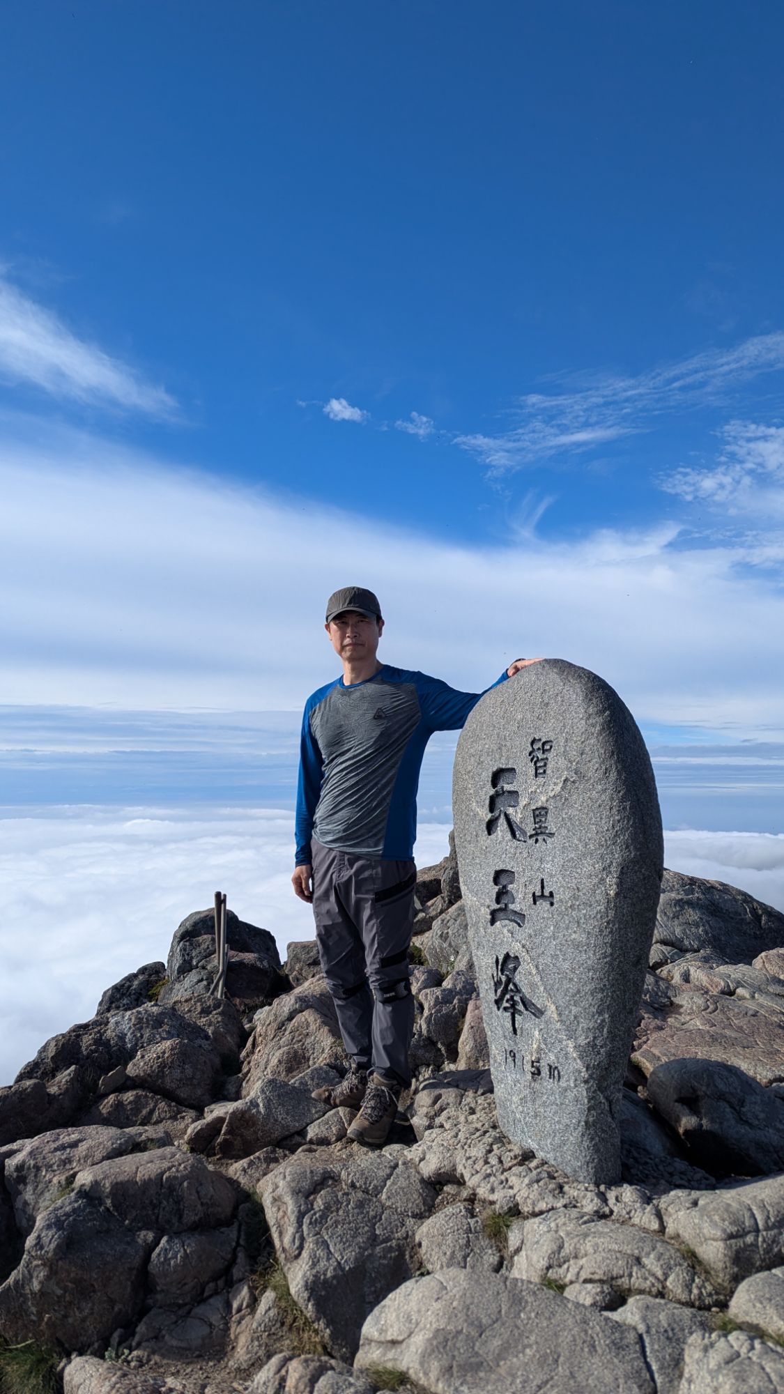천왕봉 정상에서 산객님에게 부탁해서 얻은 정상석에서의 사진 (사진 찍는 줄이 짧아서 5분만에)