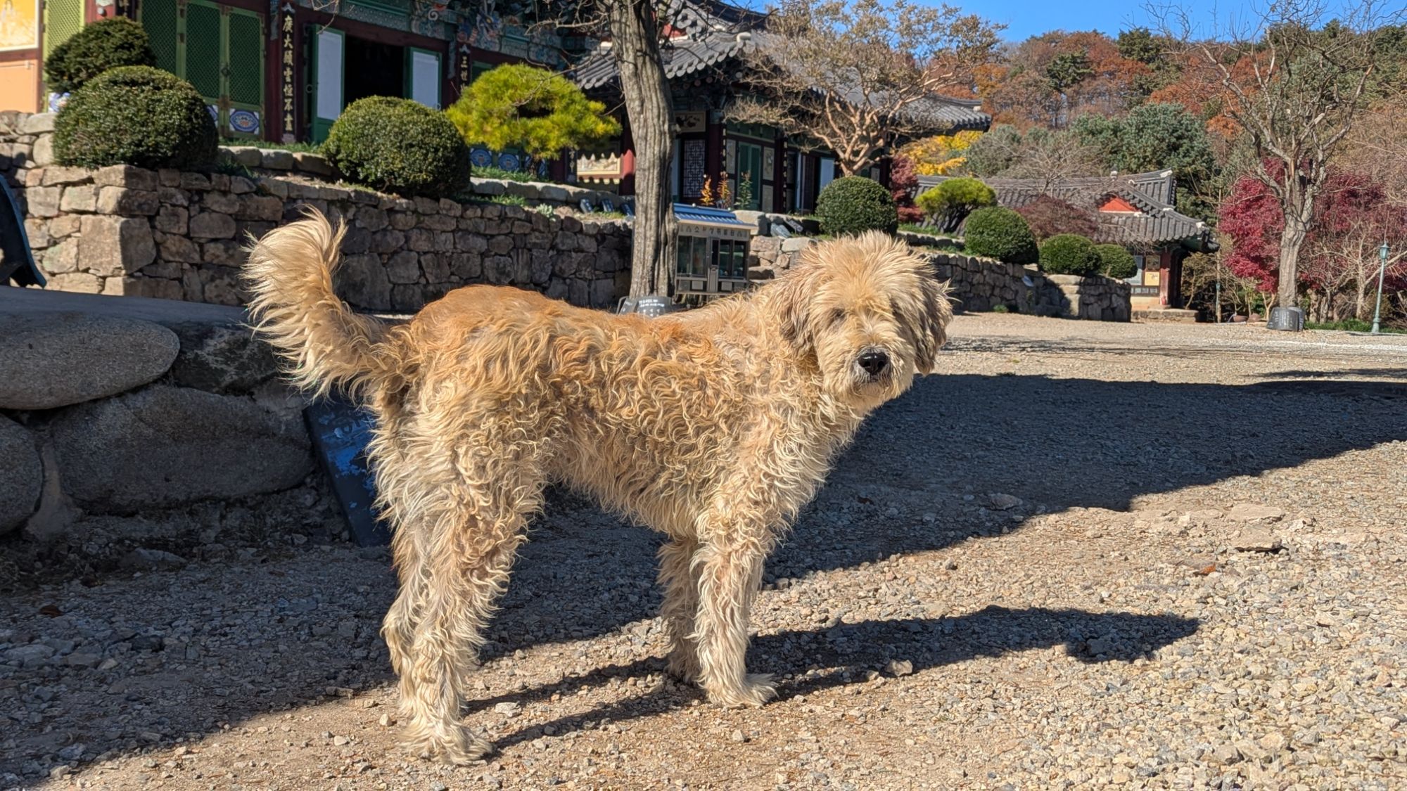 수종사에 도착한 시간이 스님들 예불시간이라 종무소 앞을 삽삽개가 지키고 있습니다. 지나가는 신자에게 강아지 이름을 물어보니 무념무상의 무념이라고 합니다 (^^)