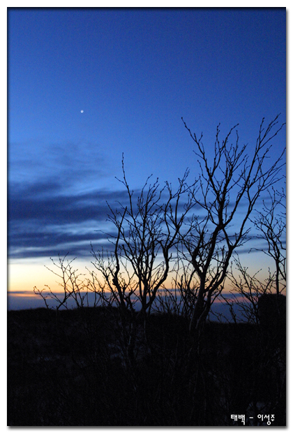 태백역에서 내릴때 국민은행 산악부를 만났읍니다. 산악부에 가입하라는 압박을 받으여 포장마차에서 라면을 먹고 유일사까지는 택시로 이동하였읍니다. 유일사 입구에는 벌써 수 많은 사람들이 아이젠과 렌턴을 달고 산행을 준비하고 있었읍니다. 처음하는 새백등반.. 셀레는 마음으로 달빛을 길잡이삼아 눈길을 밝을 때마다 “뽀드득” 소리를 음악삼아 2시간만에 장군봉에 도착.. 이미 많으 사람이 모여있었읍니다..조금 후에 여명과 일출을 보면서 셔터를 누루기를 몇번 .. 아쉬움을 뒤로 하고 하산… 힘든 만큼 앋즐거운 산행이었읍니다
